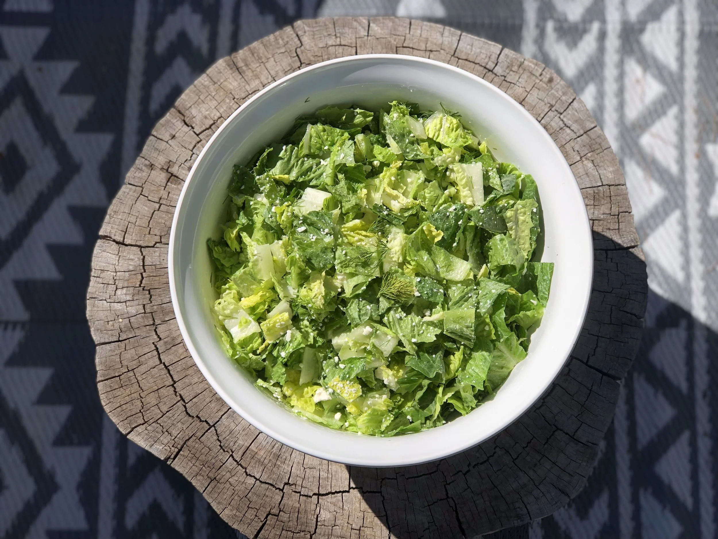 Mix all of you greens together and before you add your feta just massage the lettuce a little bit. Toss it all together then whip up your dressing, Make this to taste and modify as needed. When you are ready to serve, toss the dressing in and enjoy!